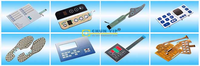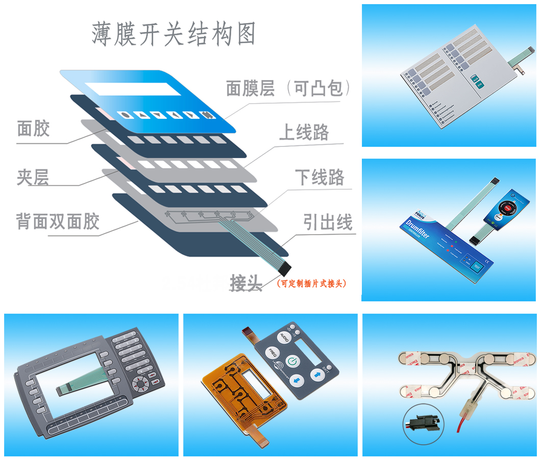 A:超大薄膜開關、薄膜鍵盤、圖形覆蓋、薄膜電路、LED背光薄膜開關、LGF背光薄膜開關、EL背光薄膜開關、電容薄膜開關、橡膠鍵盤薄膜開關、FPC電路膜開關、PCB電路板薄膜開關、金屬背板膜開關、丙烯酸/PC背板薄膜開關、防水薄膜開關、防紫外線膜開關、防刮膜開關、數字印刷膜開關等。