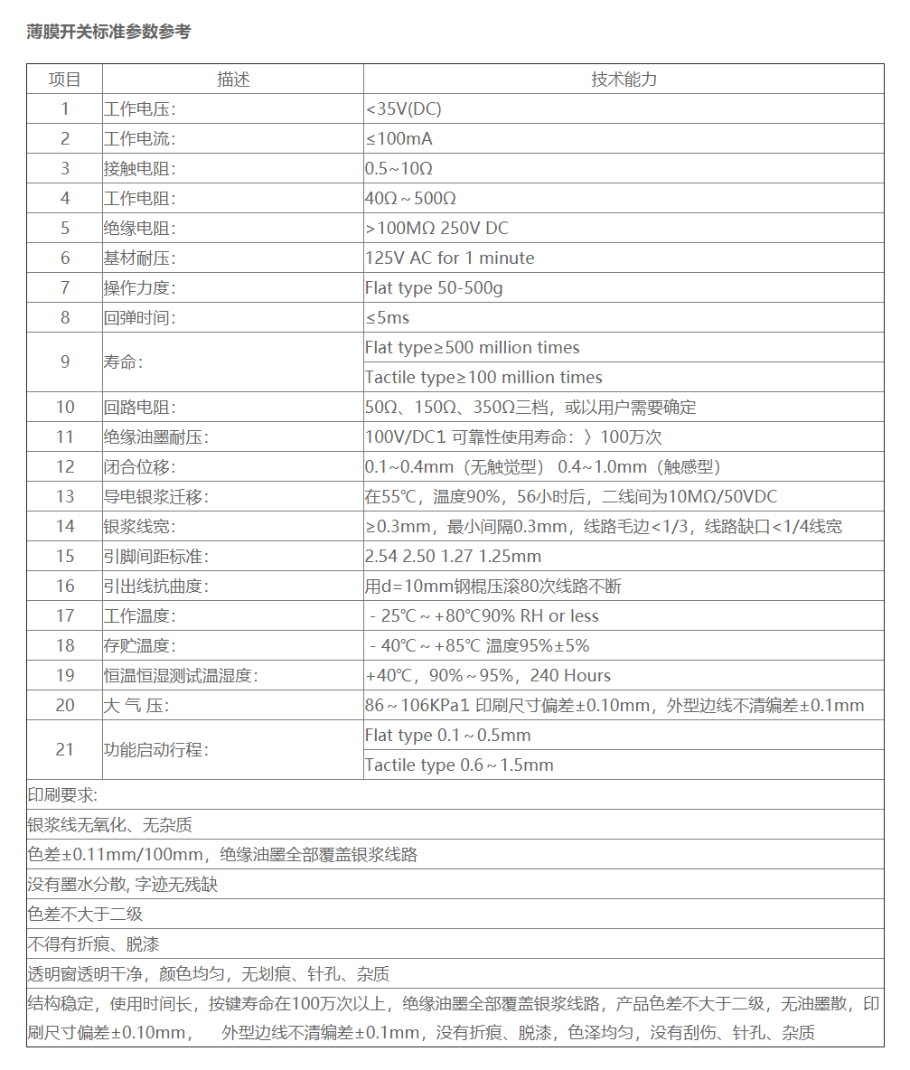 公司已通過ISO9001:2015質量管理體系認證,SGS認證,AAA級信用企業。我們為全球客戶提供電容和電阻薄膜開關及按鍵面貼、觸摸薄膜開關、硅橡膠按鍵、薄膜面板、PCB集成電路和FPC組合式薄膜開關,以及提供OEM和ODM薄膜開關系列產品的整體解決方案!